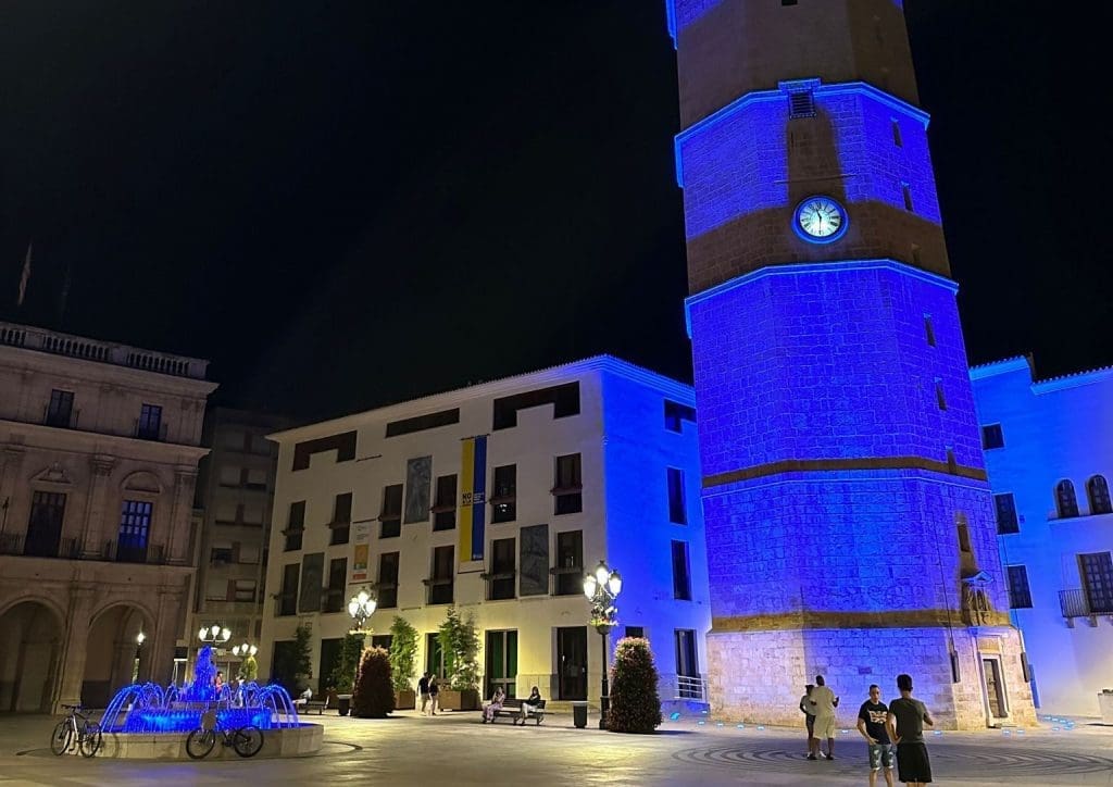 La iluminación de color azul se mantendrá hasta el domingo por la noche y el lunes ambos monumentos de la plaza Mayor de Castellón se iluminarán de amarillo a petición de la Asociación Española para el Síndrome de Rubinstein-Taybi con el objetivo de dar visibilidad a las personas que lo padecen.