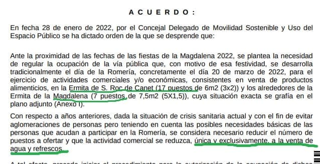 En este caso se trata de los puestos de venta ambulante que se instalan habitualmente alrededor de las ermitas de Sant Roc y de la Magdalena, para el día de la Romería de les Canyes. En concreto, son de 17 puestos en las inmediaciones de Sant Roc y 7 en las de la Magdalena. No obstante, el acuerdo que ha pasado hoy por junta tiene una matización notable, y es que estos puestos solo podrán vender exclusivamente, agua y refrescos. Al menos según se apunta en el acuerdo: «Con respecto a años anteriores, dada la situación de crisis sanitaria actual y con el fin de evitar aglomeraciones de personas pero teniendo en cuenta las posibles necesidades básicas de las personas que acudan a participar en la Romería, se considera necesario reducir el número de puestos a ofertar y que la actividad comercial se reduzca, única y exclusivamente, a la venta de agua y refrescos».