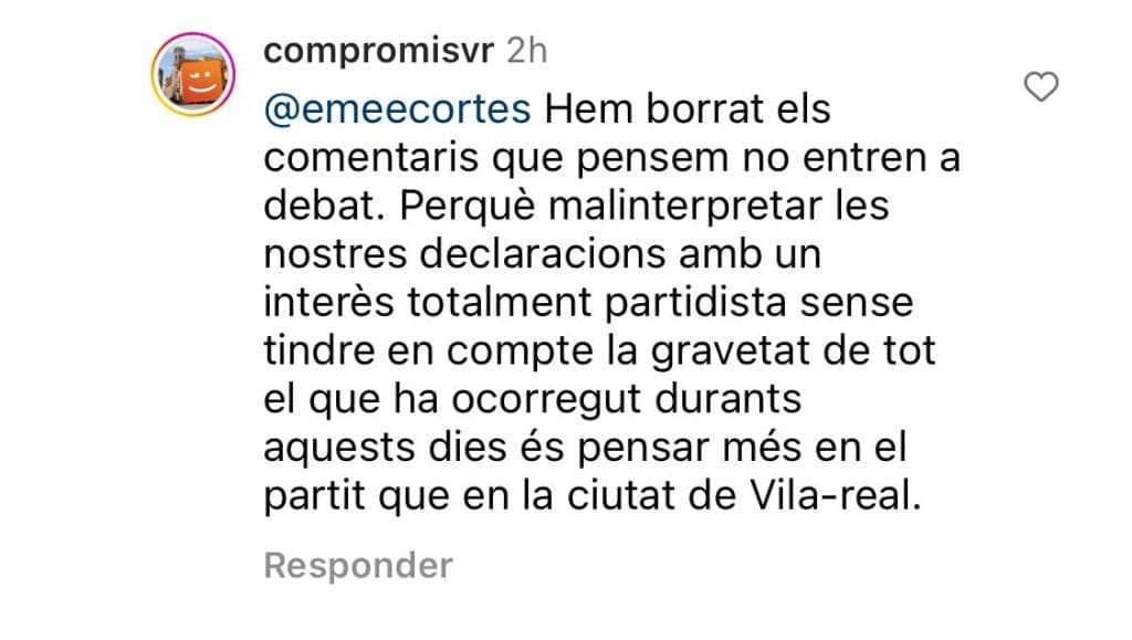 Las declaraciones de Compromís han causado revuelo en las redes sociales de la formación nacionalistas, de modo que los propios miembros de Compromís han borrado comentarios en Instagram de vecinos que criticaban las declaraciones. La formación nacionalista ha alegado en la propia red que el borrar comentarios se debía a que «no entran al debate».