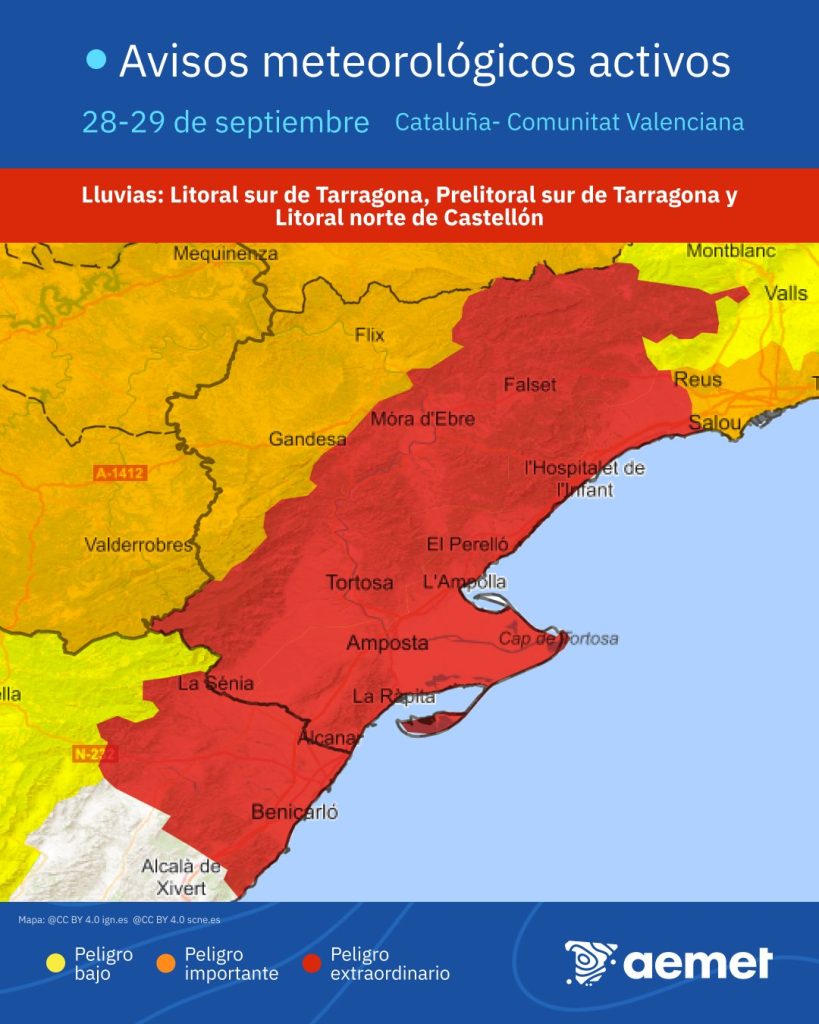 El riesgo será hoy extremo a partir de las 20 horas en el litoral sur y el prelitoral sur de Tarragona, y en el litoral norte de Castellón, por precipitaciones acumuladas de 180 litros por metro cuadrado en doce horas y que podrían acumularse incluso en solo 3 o 4 horas.