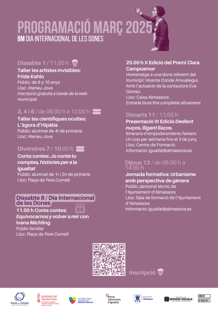 El Ayuntamiento de Almassora ha programado talleres creativos y cuentacuentos para visibilizar el papel de mujeres que han contribuido con su legado a escribir la historia con motivo del 8M, Día Internacional de la Mujer. La concejala de Bienestar Social, Eugenia Martinavarro, ha presentado la agenda diseñada durante el mes de marzo por la Unidad de Igualdad para conmemorar esta jornada. Para asistir a algunas de las propuestas es necesario inscribirse previamente en la página web municipal.