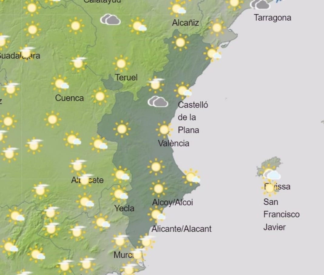 Finalmente, en Alicante, se esperan máximas de 31º en Orihuela, 30º en Alcoi, 29º en Elche y Dénia, y 28º en Alicante. Las mínimas serán de 17º en Alcoi, 20º en Elche y Orihuela, 21º en Dénia y 22º en Alicante.