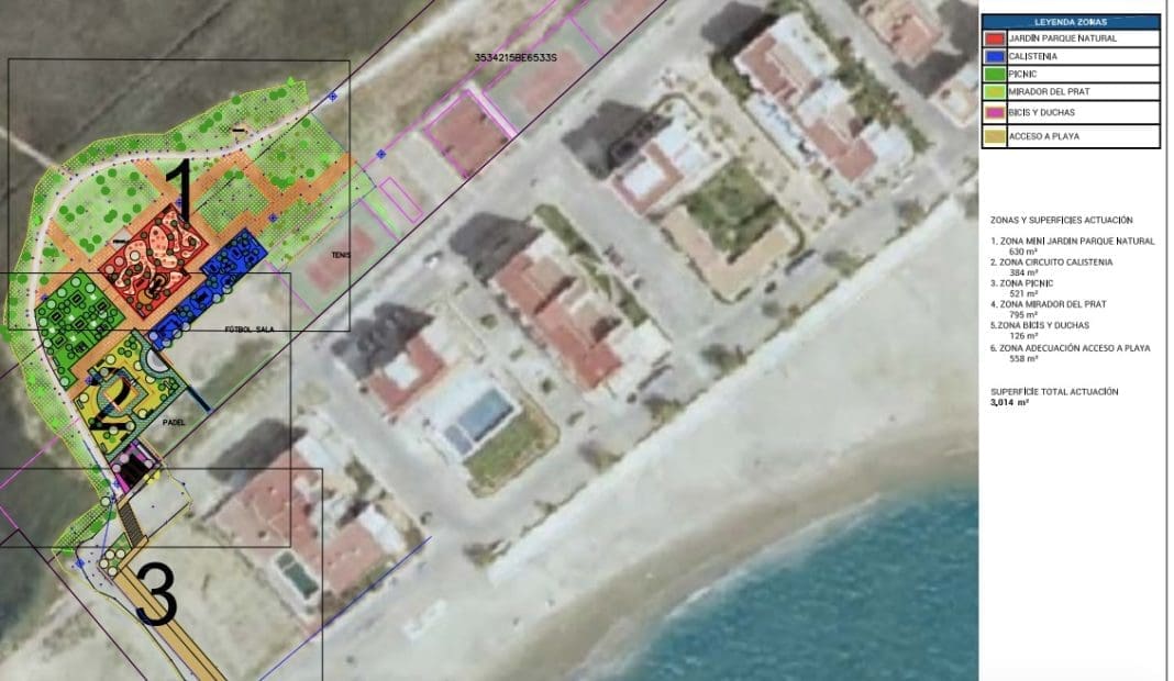 Se combinarán zonas naturales, zonas ajardinadas y paseos peatonales, además de habilitar una zona de duchas para los usuarios de este espacio, así como de los de la playa, acometiendo unos accesos adecuados a la playa natural del Prat. También está prevista la construcción de un quiosco-bar en el futuro para dar servicio tanto a los usuarios de estas instalaciones, como de la playa.