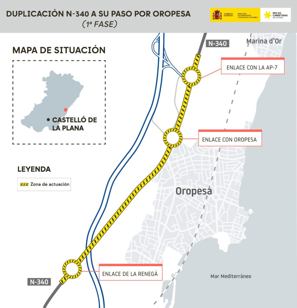 El Ministerio de Transportes y Movilidad Sostenible ha iniciado las obras de la primera fase para duplicar la N-340 a su paso por Oropesa. La actuación abarca seis kilómetros, entre los puntos 992 y 998, y cuenta con una inversión de 28,5 millones de euros.