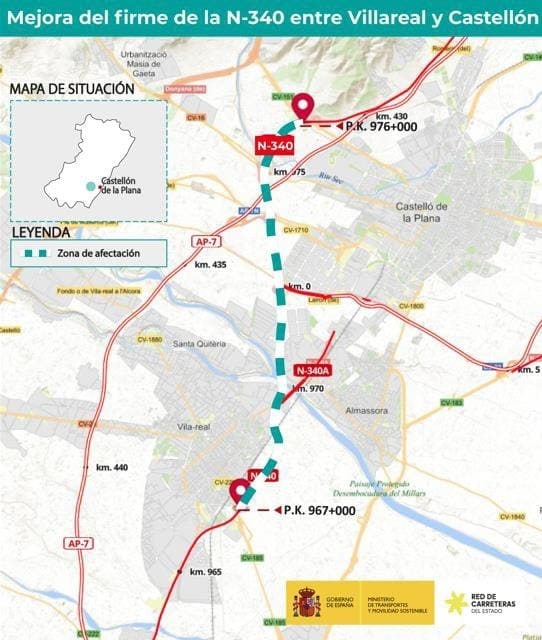 El Ministerio de Transportes y Movilidad Sostenible inicia el próximo miércoles 21 de mayo las obras de mejora del firme en un tramo de aproximadamente 9 kilómetros de la carretera N-340, entre Vila-real (km 967) y Castellón (km 976). Estos trabajos de mejora en la carretera N-340, tienen como objetivo la mejora de la seguridad vial y la circulación en este eje clave del tráfico en la provincia de Castellón. Para ello cuentan con un presupuesto superior a 1,6 millones de euros (IVA incluido).