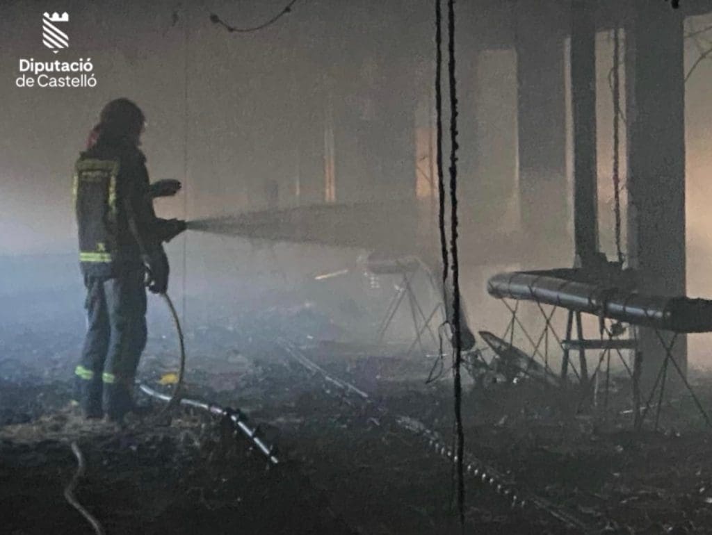 21.000 pollos mueren en un incendio en explotación avícola de Los Rosildos, Castellón. Bomberos trabajan en extinción del fuego.