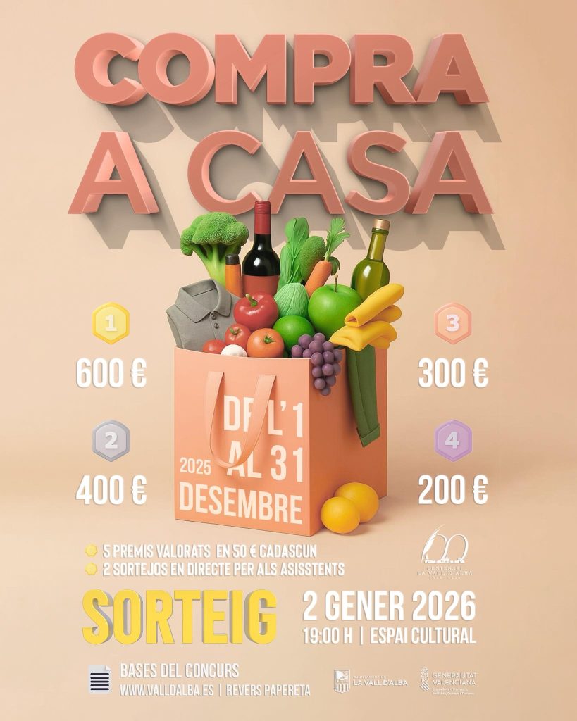 El Ayuntamiento de Vall d’Alba ha puesto en marcha una nueva edición de la campaña ‘Compra a Casa’. Una iniciativa ya consolidada que busca incentivar las compras navideñas en los comercios del municipio y reforzar el tejido económico local.