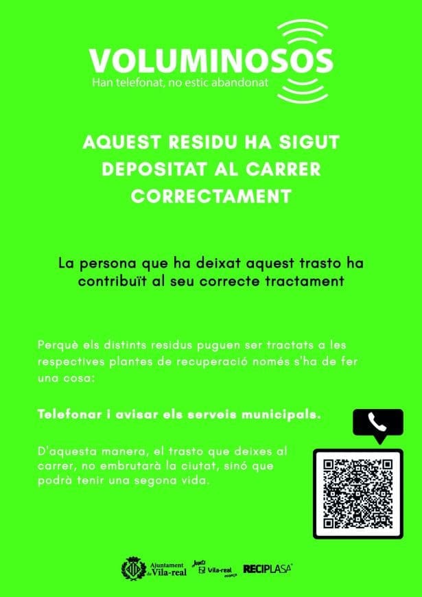 La campaña ‘Civismo verde’ pretende, por un lado, valorar el gesto responsable de los vecinos y vecinas que utilizan de forma correcta el servicio gratuito de recogida que ofrece el Ayuntamiento de Vila-real, a través de la Concejalía de Servicios Públicos, y que han depositado adecuadamente el voluminoso o RAEE para su retirada, de manera que se puede favorecer su reutilización y reciclaje.