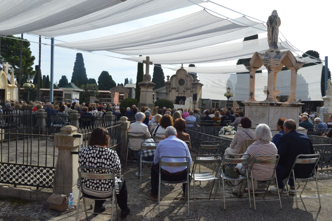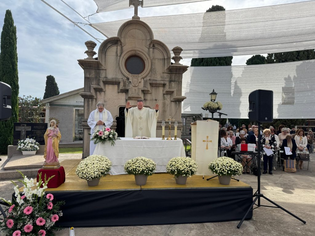 El Ayuntamiento de Vila-real ha conmemorado hoy la Festividad de Todos los Santos en el Cementerio Municipal. Así, como es habitual, la explanada central del Cementerio ha acogido el rezo del rosario y la eucaristía, actas organizados por la Asociación de Hijas de Maria del Rosario. Desde el Ayuntamiento se han puesto sillas a disposición de los asistentes y se han instalado toldos para proteger de las inclemencias del tiempo.
