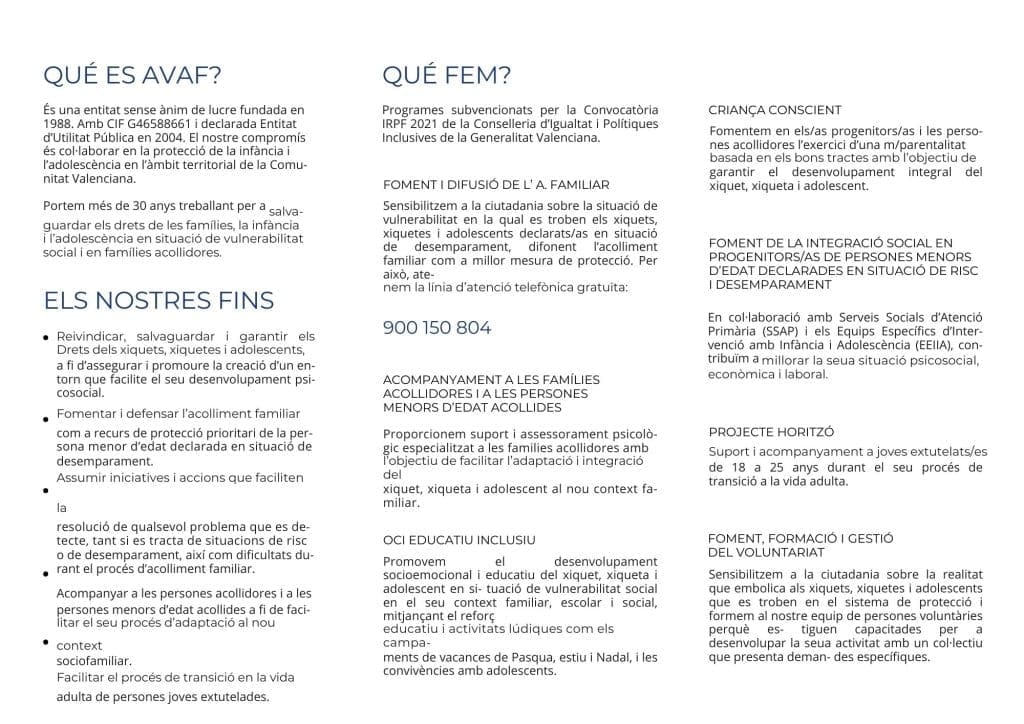 “El principal objetivo de Avaf es ayudar a resolver situaciones de riesgo o desamparo, acompañar a las familias y a las personas acogedoras de menores de edad y ayudar también a estos menores en la transición desde la infancia a la vida adulta”, remarca Marín, quien reitera la apuesta del consistorio por la alianza social con entidades como Avaf “de la que nos sentimos muy orgullosos”.