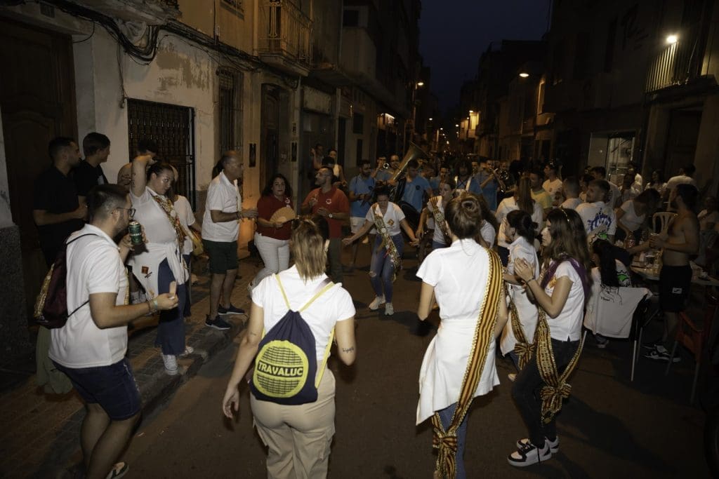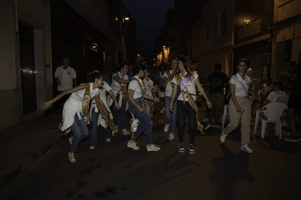 La reina de las fiestas del 2023, Gracia Gumbau, y las damas de su corte de honor no quisieron perderse esta cita, donde visitaron a las peñas, acompañadas de charangas del municipio.