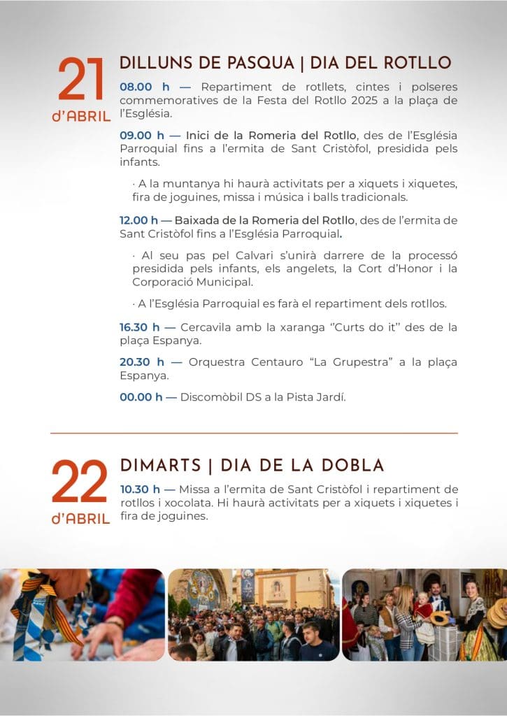 Actualmente, la Festa del Rotllo rememora este hecho. La “Romería del Rollo o de Infantes”, que discurre desde la iglesia parroquial hasta la ermita de San Cristóbal, va seguida de todos aquellos que deseen participar. A los romeros se les obsequia con una cinta conmemorativa de la fiesta y un rollito de masa de harina, miniatura del que da nombre a la celebración.
