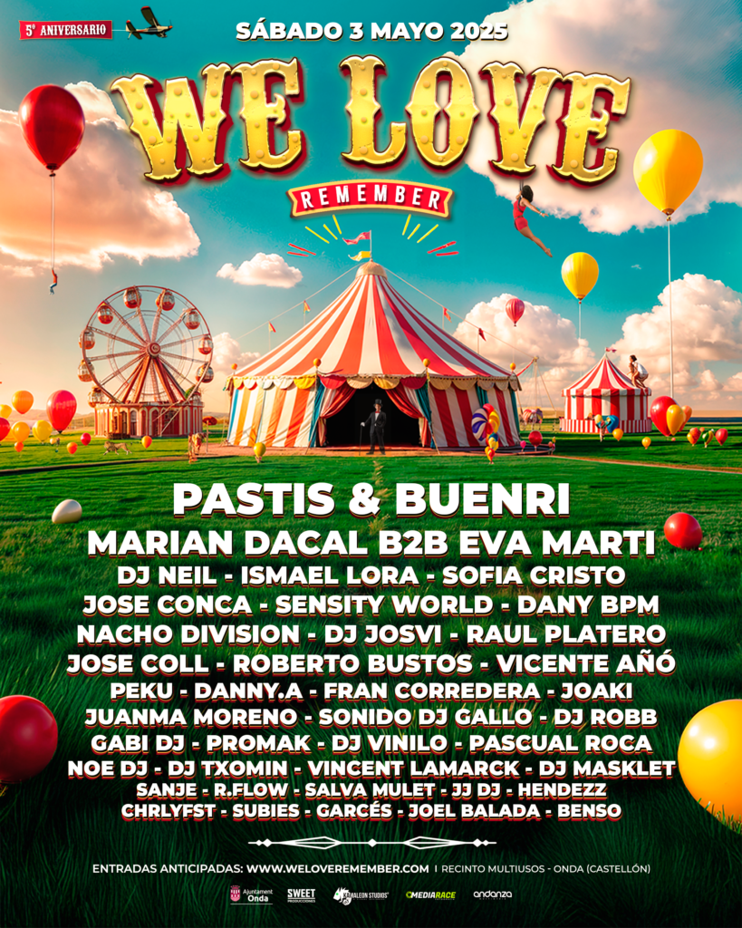 Onda volverá a convertirse en el epicentro de la música dance y remember con la quinta edición de We Love Remember, el festival que ya se ha consolidado como una de las citas imprescindibles para los amantes del género. La nueva edición, organizada por el Ayuntamiento de Onda junto a Sweet Producciones, se celebrará el próximo sábado 3 de mayo en el Recinto Multiusos, ofreciendo 11 horas de música ininterrumpida y un cartel repleto de leyendas del género.